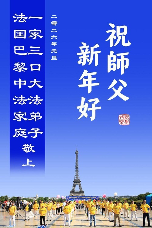 Практикующие из семьи из Циндао в провинции Шаньдун в Китае, которые сейчас проживают во Франции, поздравляют уважаемого Учителя с Новым годом!