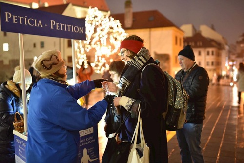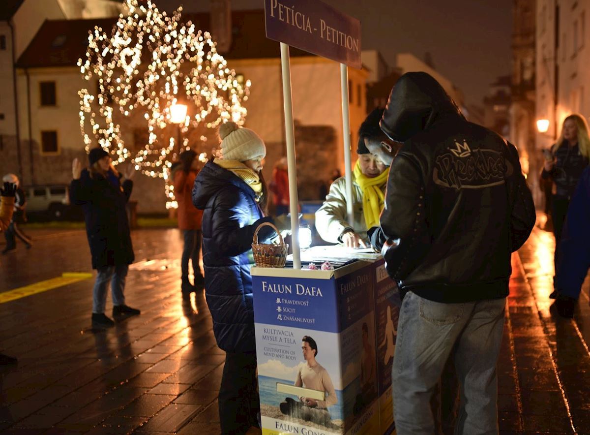 Пожилой мужчина из Братиславы, подписавший петицию, увидел параллель между преследованием людей коммунистическим режимом в Китае и преследованием других групп в прошлом, таких как евреи. По совпадению, еврейская община ранее располагалась недалеко от места проведения мероприятия практикующих, у бывших Выдрицких ворот в средневековой Братиславе, где сейчас установлен мемориал.