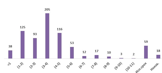 На диаграмме: по вертикали – число осуждённых практикующих; по горизонтали – сроки заключения (в годах)
