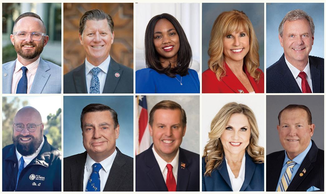 Второй ряд, слева направо: Марк Арапостафис, мэр Ла-Месы; Джоэл Андерсон, член наблюдательного совета округа Сан-Диего; Джон Макканн, мэр Чула-Висты (второго по величине города округа Сан-Диего); Ребекка Джонс, мэр Сан-Маркоса; и Джон Минто, мэр города Санти
