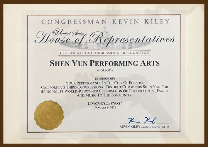 Сертификат от члена Палаты представителей США Кевина Кайли (3-й избирательный округ штата Калифорния), вручённый 6 января 2026 года, в день выступления Shen Yun Performing Arts в городе Фолсом (штат Калифорния)