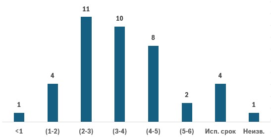 На диаграмме: по вертикали – число осуждённых практикующих; по горизонтали – сроки тюремного заключения (в годах)