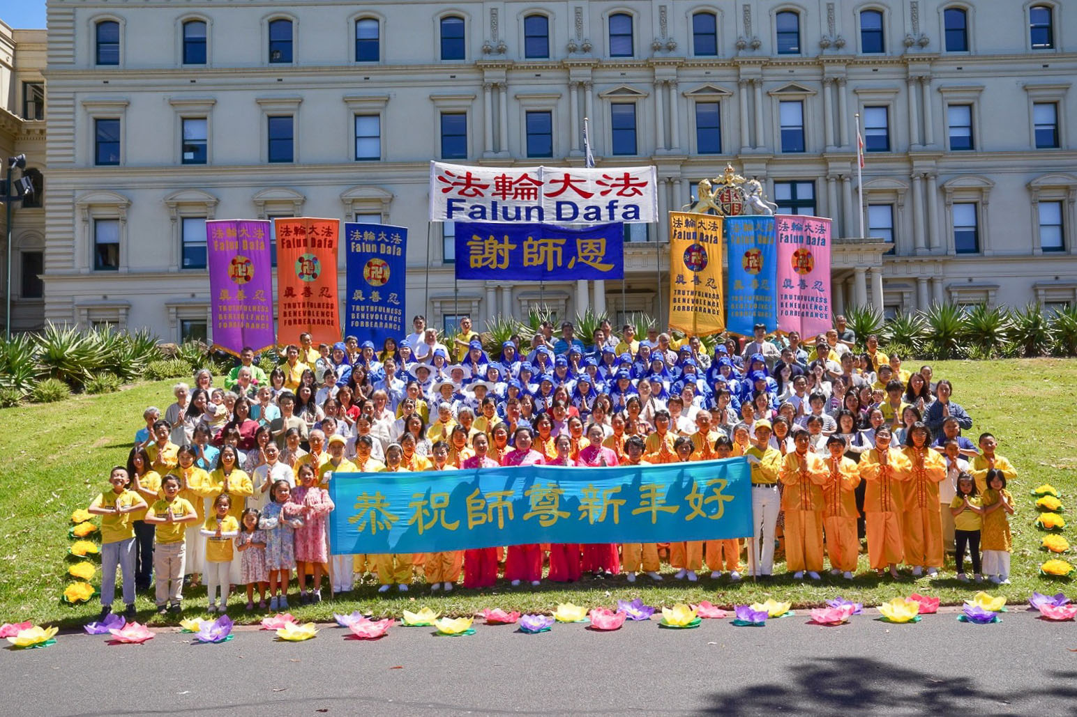 Практикующие Фалунь Дафа желают уважаемому Учителю Ли счастливого китайского Нового года во время празднования в Treasury Gardens в Мельбурне