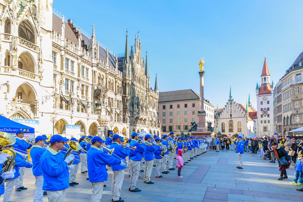 Европейский духовой оркестр Тянь Го выступает на Мариенплац в Мюнхене, Германия, 29 октября 2021 года