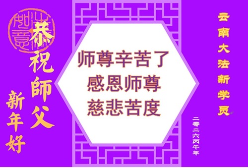 (Minghui.org) В преддверии китайского Нового года, который в этом году отмечается 17 февраля, практикующие, недавно начавшие совершенствоваться по Фалунь Дафа, направили свои сердечные поздравления Учителю Ли Хунчжи, пожелав основателю практики счастливого праздника.