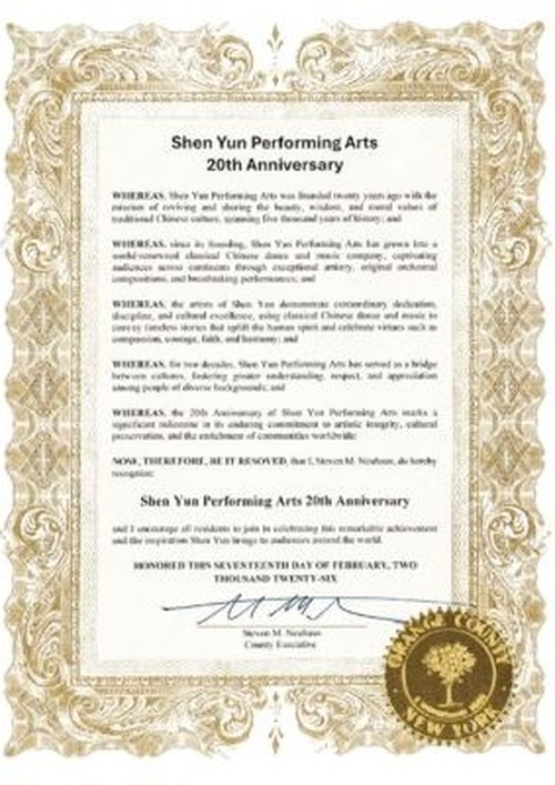 (Minghui.org) В честь 20-летия компании Shen Yun Performing Arts Стивен Нойхаус, глава округа Ориндж (штат Нью-Йорк, США), где находится штаб-квартира компании, издал благодарственное письмо, признающее достижения компании Shen Yun Performing Arts, и поздравил её в видеообращении.