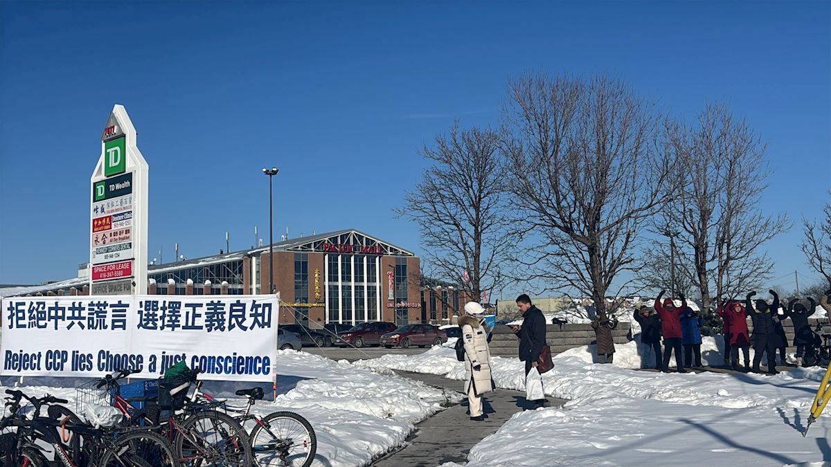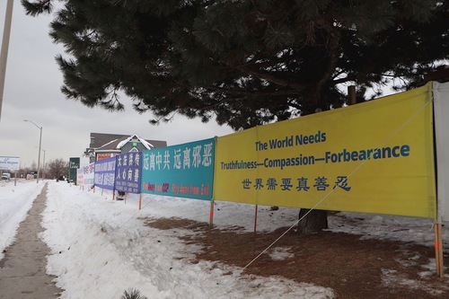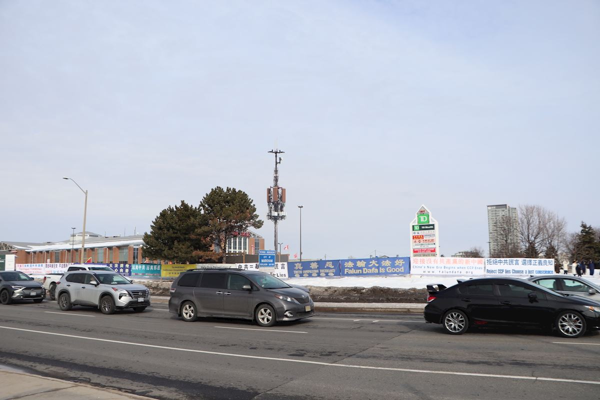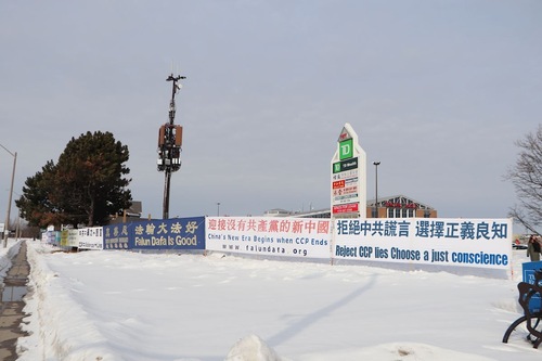 Практикующие из Торонто установили информационный пункт разъяснения правды на перекрёстке рядом с площадью, и водители, проезжающие со всех сторон, издалека могут видеть их плакаты. Водители часто сигналят или показывают практикующим поднятый вверх большой палец, чтобы подбодрить их. Практикующие находятся в этом месте уже два десятилетия. Несмотря на снежные бури зимой и палящее солнце летом, они каждый день вывешивают плакаты. Даже в самые холодные дни, когда температура опускается до -20 градусов по Цельсию, они приходят сюда, чтобы рассказывать людям правду о преследовании и помогать им выйти из рядов компартии Китая. В среднем каждый день они помогают по меньшей мере двенадцати человекам выйти из компартии Китая (КПК) и принадлежащих ей организаций.