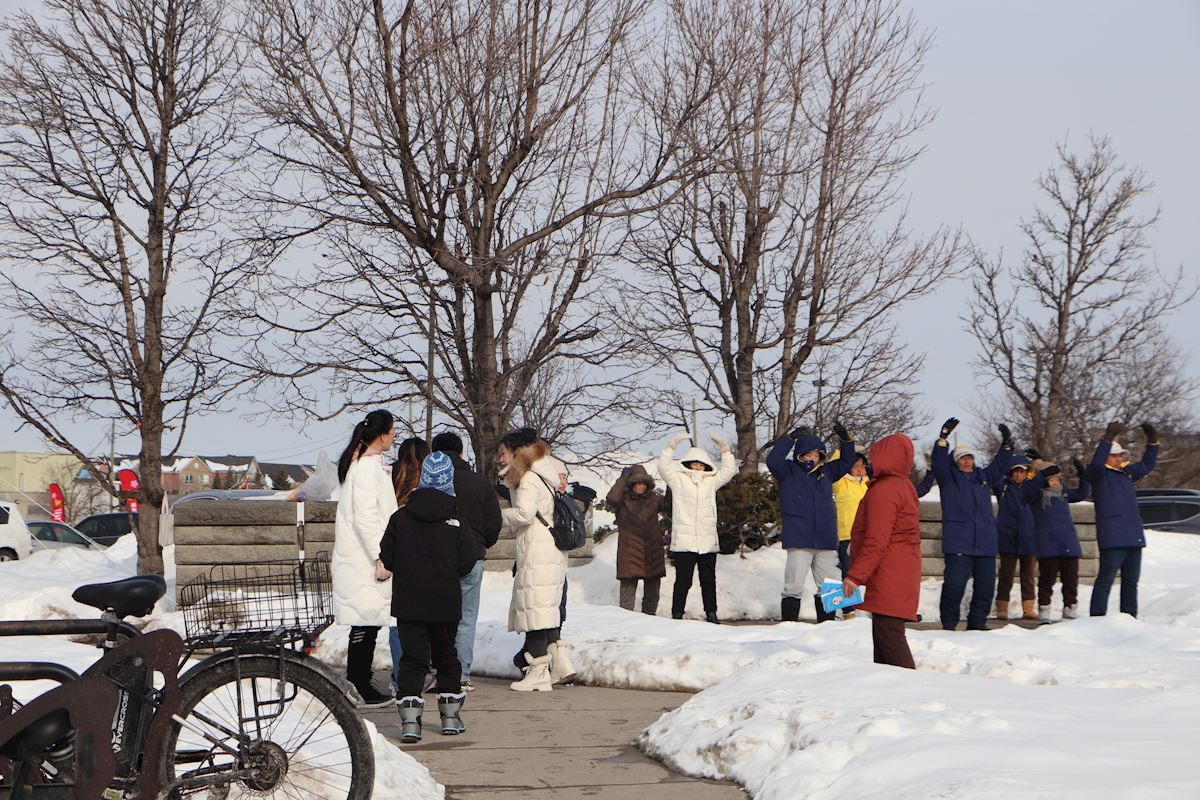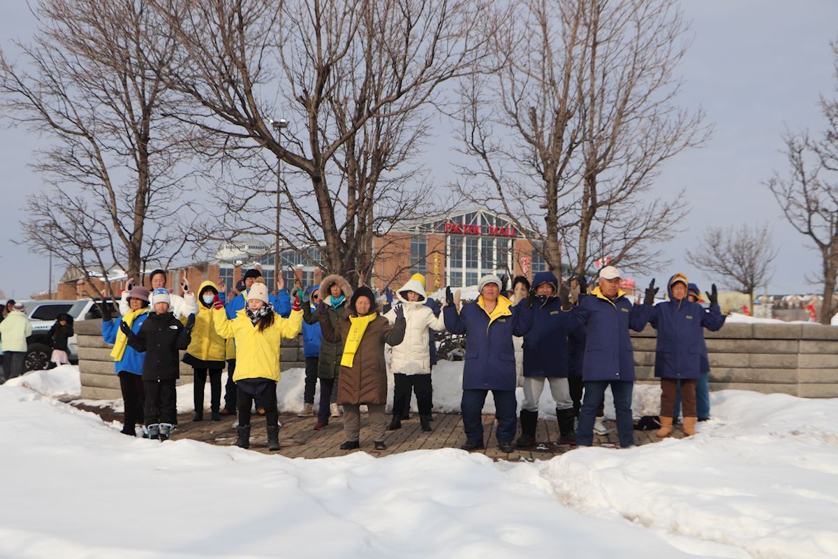 Несмотря на холодную зимнюю погоду, практикующие демонстрируют упражнения, разъясняют людям правду и помогают прохожим выйти из КПК