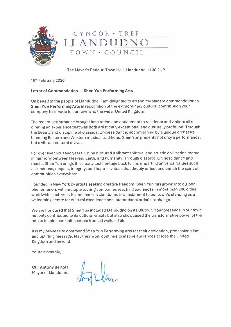 (Minghui.org) 16 февраля 2026 года Энтони Бертола, мэр города Лландидно в Великобритании, направил в адрес коллектива Shen Yun Performing Arts благодарственное письмо в знак признания его выдающегося вклада в культурную жизнь города и Великобритании в целом.
