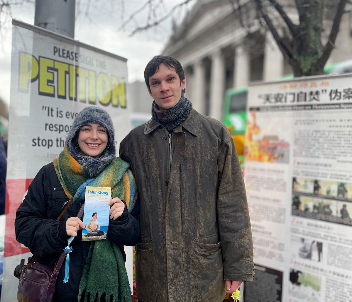 Люди останавливались, чтобы понаблюдать, как практикующие выполняют упражнения, многие подписали петицию с призывом прекратить преследование. Ирэн и её друг Роуэн из Нидерландов остановились, чтобы узнать больше о Фалунь Дафа. «Мне близки принципы "Истина, Доброта, Терпение", потому что это основные ценности, которым должен следовать каждый человек», – сказала Ирэн. Роуэн согласился с ней.