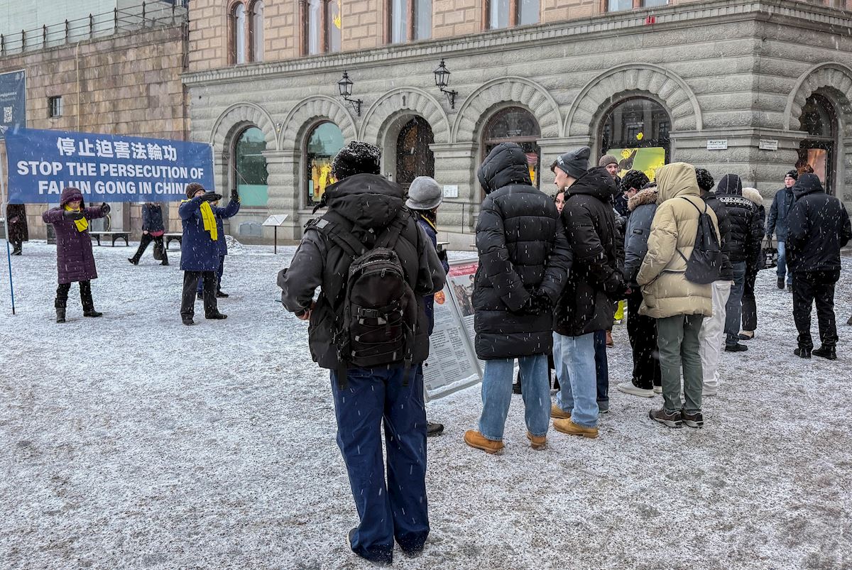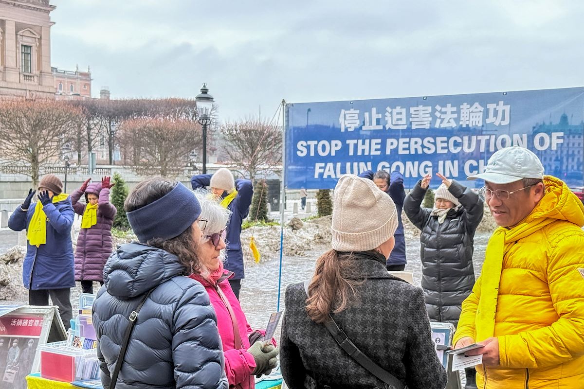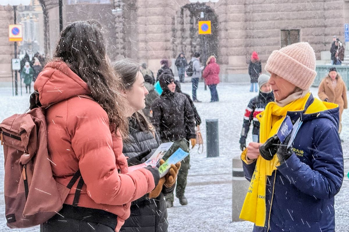 24 января 2026 года в Стокгольме выпал снег, и температура опустилась до -8º C (17,6º F). Несмотря на холод и снег, практикующие продолжили мероприятие. Люди останавливались, чтобы поговорить с ними, благодарили последователей Дафа за мужество и стойкость и подписывали петицию.