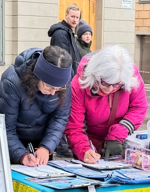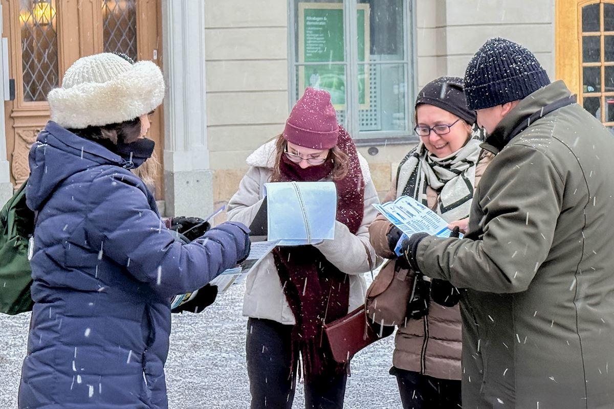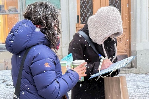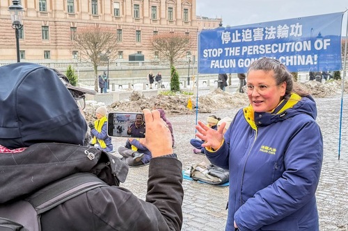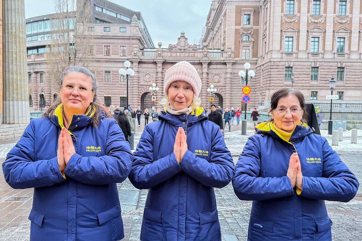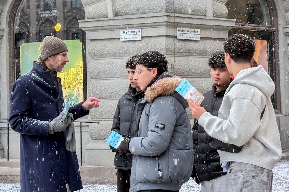 24 января 2026 года в Стокгольме выпал снег, и температура опустилась до -8º C (17,6º F). Несмотря на холод и снег, практикующие продолжили мероприятие. Люди останавливались, чтобы поговорить с ними, благодарили последователей Дафа за мужество и стойкость и подписывали петицию.
