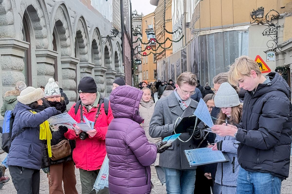 (Minghui.org) По субботам в течение января 2026 года практикующие Фалунь Дафа проводили мероприятия на площади Мюнтторгет – общественной площади, расположенной в старой части Стокгольма рядом со шведским парламентом. Они знакомили прохожих с практикой Фалунь Дафа, рассказывали о преследовании, осуществляемом компартией Китая (КПК), и собирали подписи под петицией с требованием прекратить нарушения прав человека в Китае. Несмотря на холодную погоду, многие люди останавливались, чтобы узнать больше, и подписывали петицию.
