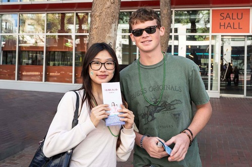 Чарльз и его подруга Эшли с восторгом встретили выступление команды Фалунь Дафа. Чарльз отметил: «Оркестр превосходный, а музыка очень мелодичная. Мне нравятся принципы “Истина, Доброта, Терпение”. Эти принципы нам сейчас просто необходимы. Сегодня особенно не хватает искренности, нам нужно вернуться к своим корням и сделать Америку лучше».