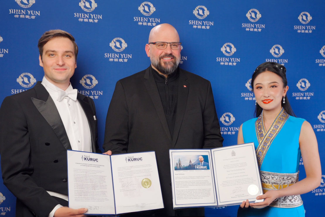 Нед Курук (в центре), член парламента от Гамильтона (район Стони-Крик), вручил благодарственную грамоту труппе Shen Yun на премьере гастрольных выступлений вечером 12 марта 2026 года (фото: NTDTV)