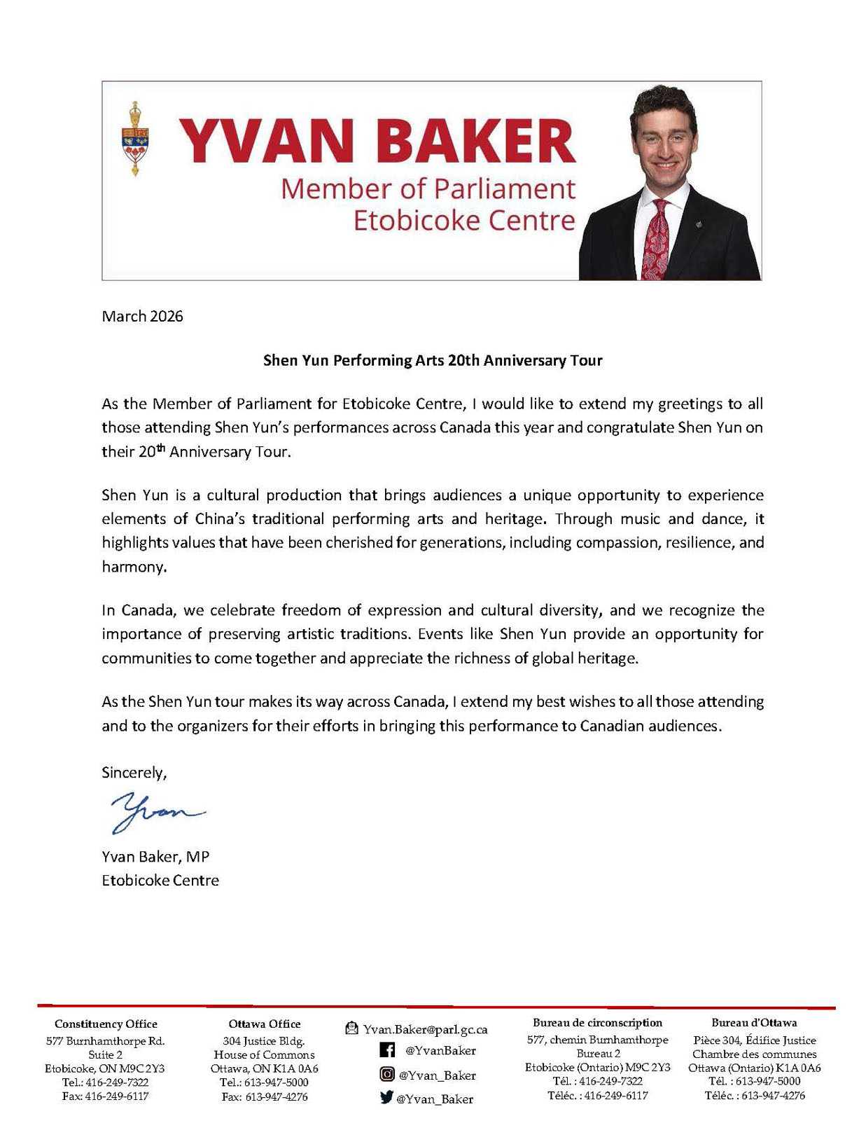 «В Канаде мы ценим свободу самовыражения и культурное разнообразие, а также осознаём важность сохранения художественных традиций, – отметил член парламента Айвен Бейкер в своём поздравительном письме. – Такие мероприятия, как представление Shen Yun, дают возможность членам сообществ собраться вместе и оценить богатство мирового наследия».