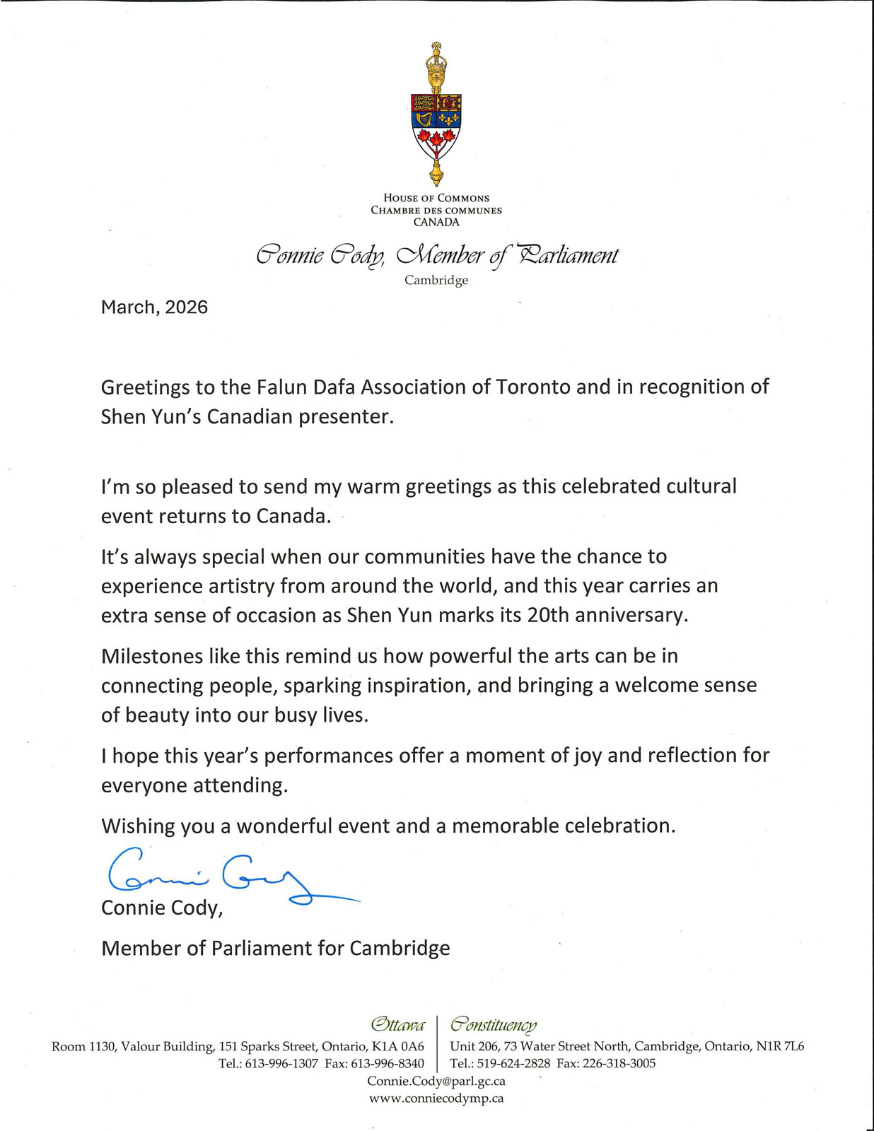 Член парламента Конни Коди отметила, что такие знаковые события, как 20-летие со дня основания компании Shen Yun Performing Arts, «напоминают нам о том, насколько сильным может быть искусство в объединении людей, пробуждении вдохновения и привнесении столь желанного ощущения красоты в нашу напряжённую жизнь».