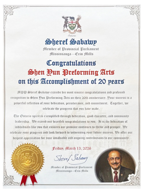 Шереф Сабави, член провинциального парламента от округа Миссиссога Эрин Миллс, написал в своей благодарственной грамоте, что он искренне поздравляет коллектив компании Shen Yun Performing Arts в связи с 20-летием со дня её основания. «Ваши достижения в полной мер отражают вашу преданность делу, настойчивость и неуклонное стремление к совершенству. Мы вместе с вами радуемся вашим успехам», – написал он.