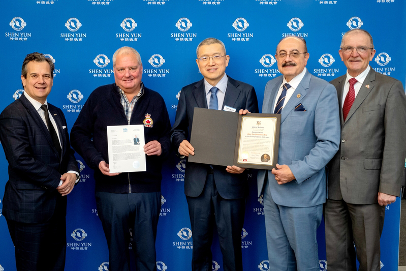 Член парламента провинции Онтарио Шереф Сабави (второй справа) вручил коллективу Shen Yun благодарственную грамоту в театре и посмотрел представление во второй половине дня 14 марта 2026 года. На фотографии также запечатлены другие официальные лица: член городского совета Миссиссоги Стивен Даско (первый слева), член городского совета Миссиссоги Брэд Батт (второй слева) и бывший член парламента Владислав Лизон (первый справа) (фото: The Epoch Times)