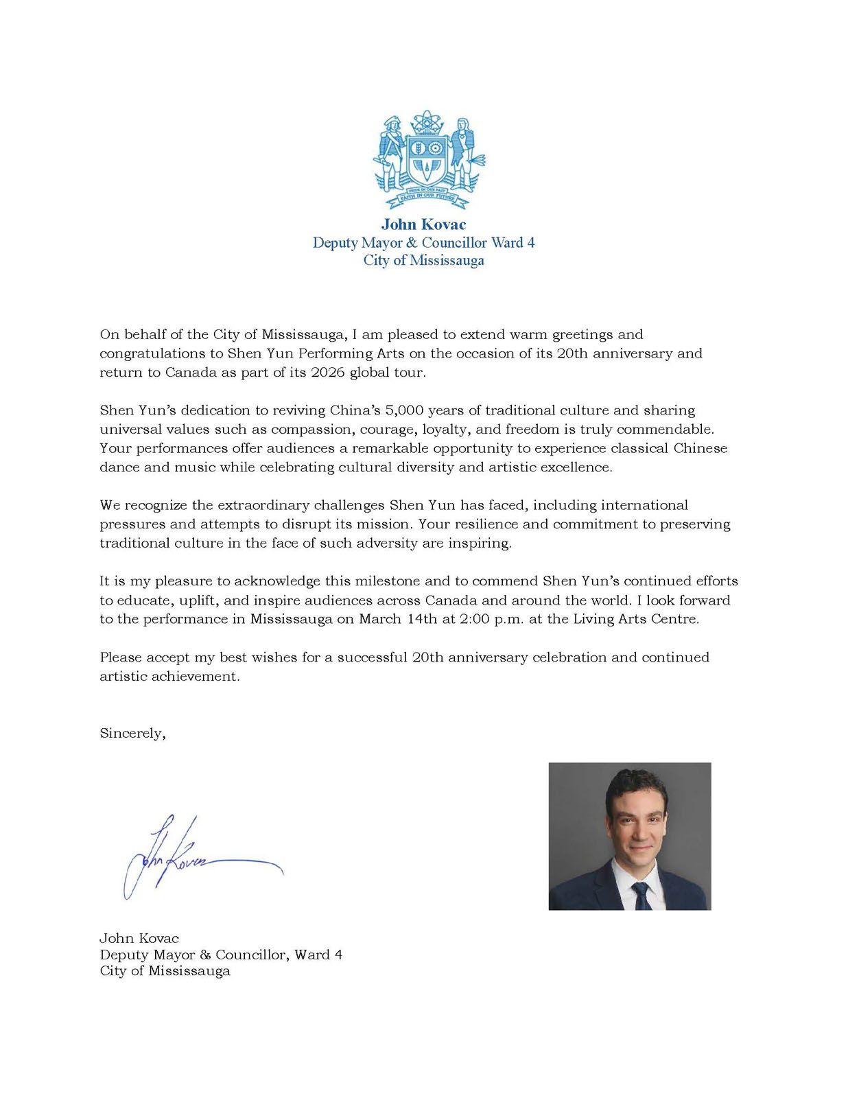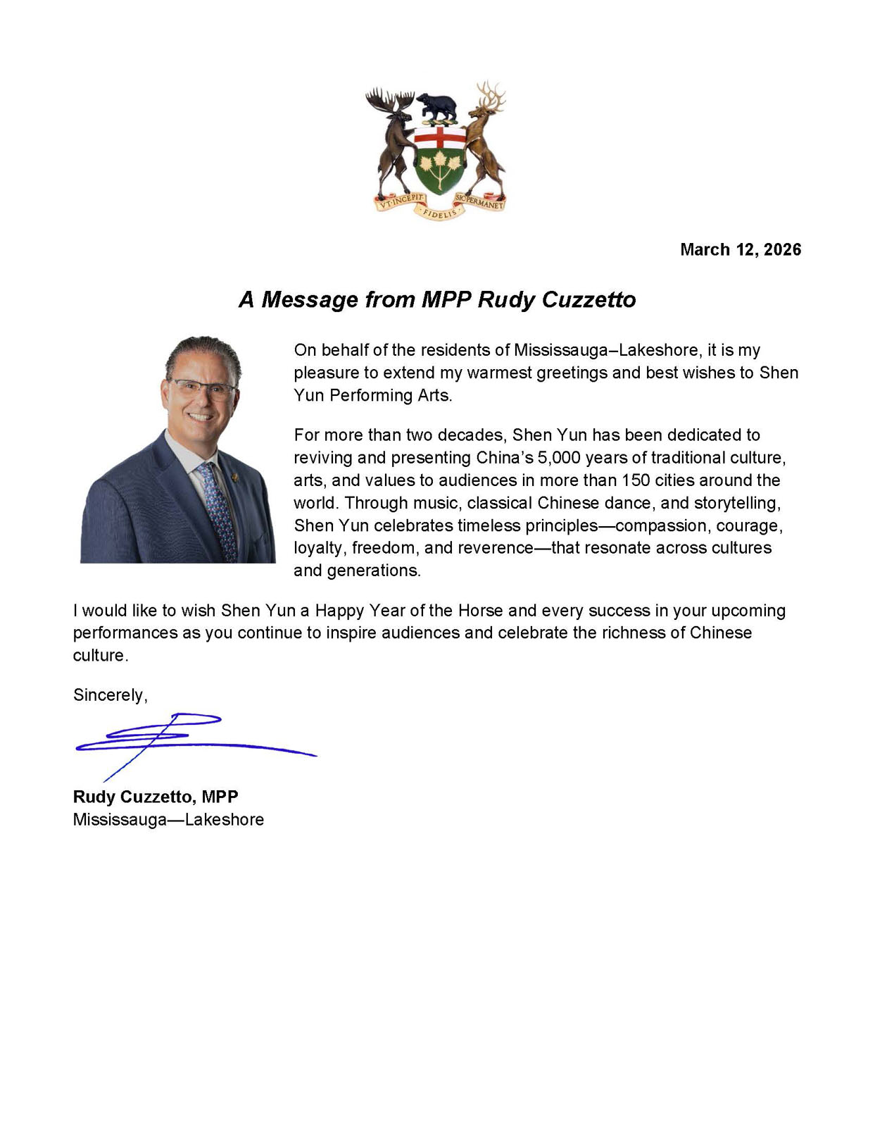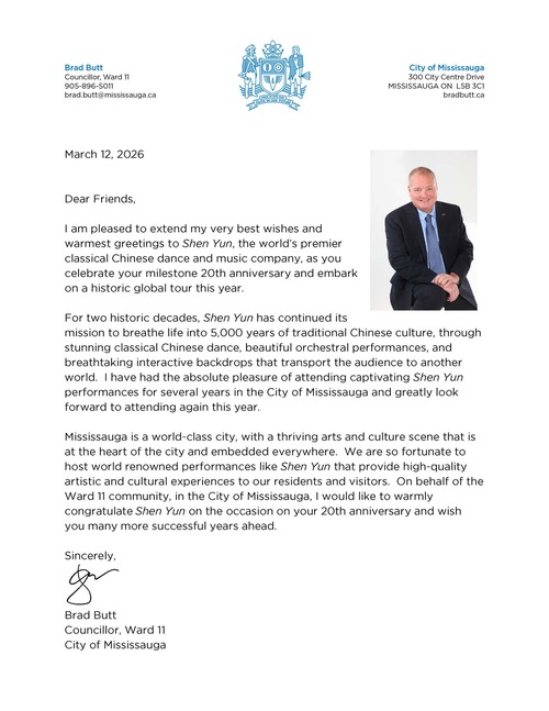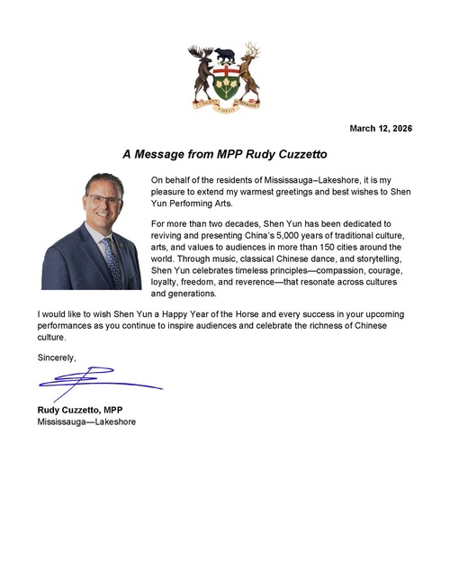 Член парламента Руди Куззетто, представляющий округ Миссиссога-Лейкшор, пожелал Shen Yun успехов в гастролях 2026 года и отметил, что коллектив продолжает «вдохновлять зрителей и прославлять богатство китайской культуры».