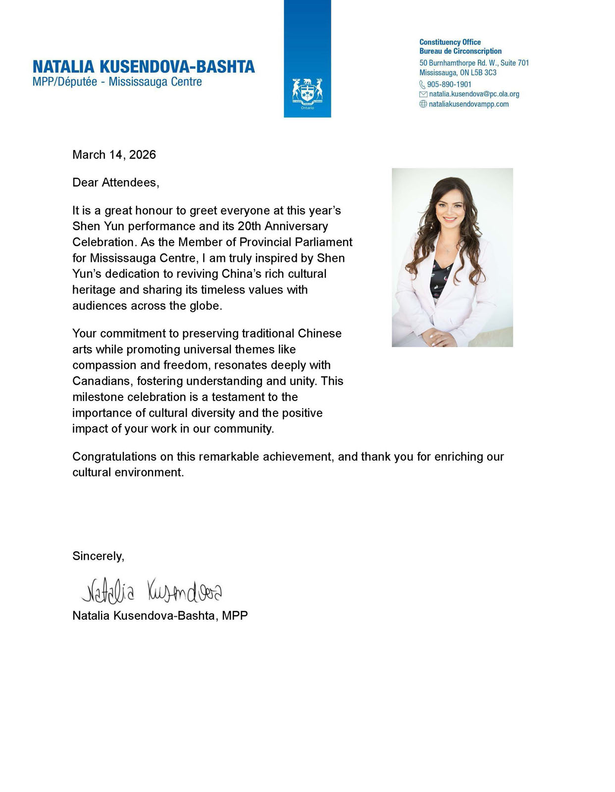 В своём поздравительном письме Наталия Кусендова-Башта, член парламента провинции Онтарио, написала: «Усилия Shen Yun по возрождению многовекового культурного наследия Китая и передаче его вечных ценностей зрителям по всему миру глубоко тронули и вдохновили меня».