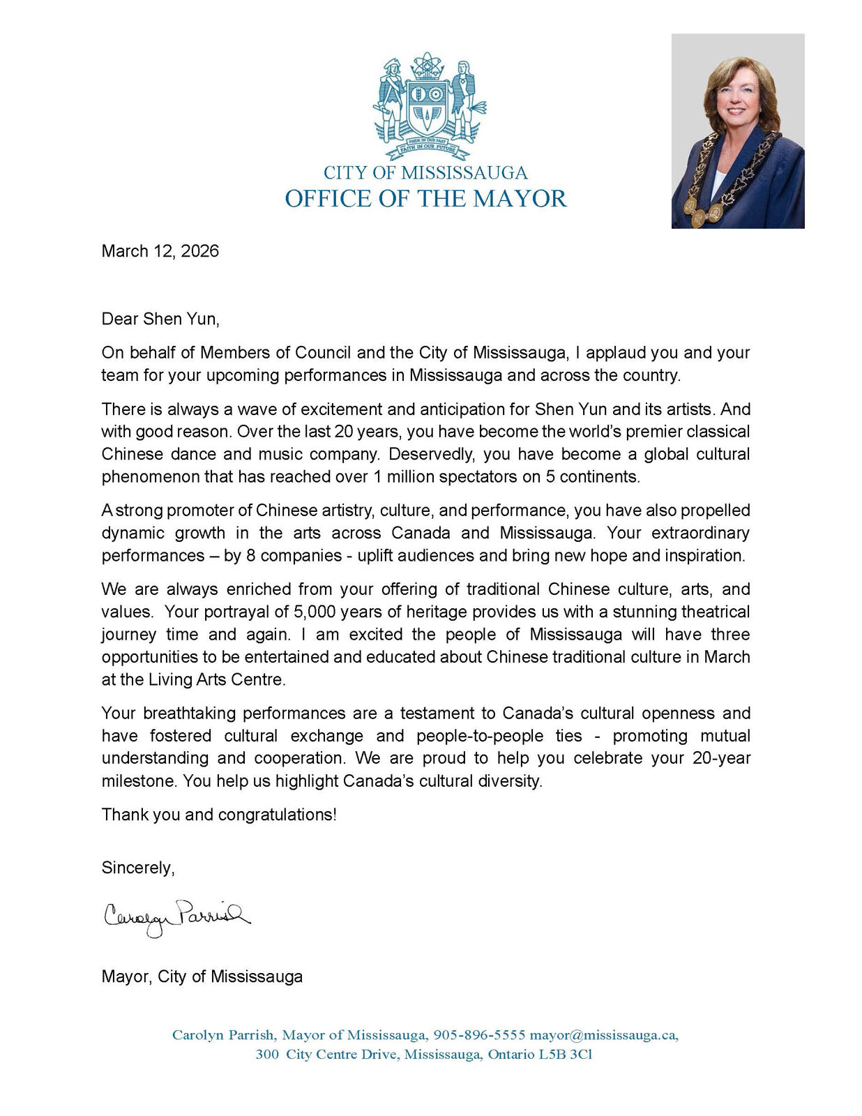 «Вы не только являетесь активными популяризаторами китайского искусства, культуры и исполнительского мастерства, но и способствуете динамичному развитию искусства по всей Канаде и в Миссиссоге. Ваши незабываемые представления, исполняемые 8 труппами по всему миру, воодушевляют зрителей и дарят им новую надежду и вдохновение, – подчеркнула она в письме. – Ваше воплощение 5000-летнего наследия снова и снова вовлекает нас в потрясающее театральное путешествие».