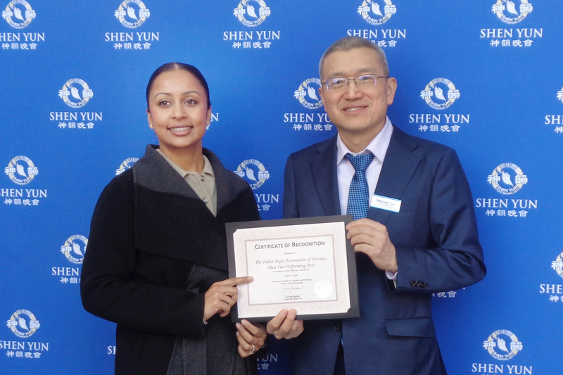 В тот день в театр прибыла секретарь члена городского совета 10-го округа Миссиссоги Сью Макфадден, чтобы от имени советника и города Миссиссоги вручить благодарственную грамоту с поздравлениями в связи с 20-летием Shen Yun.