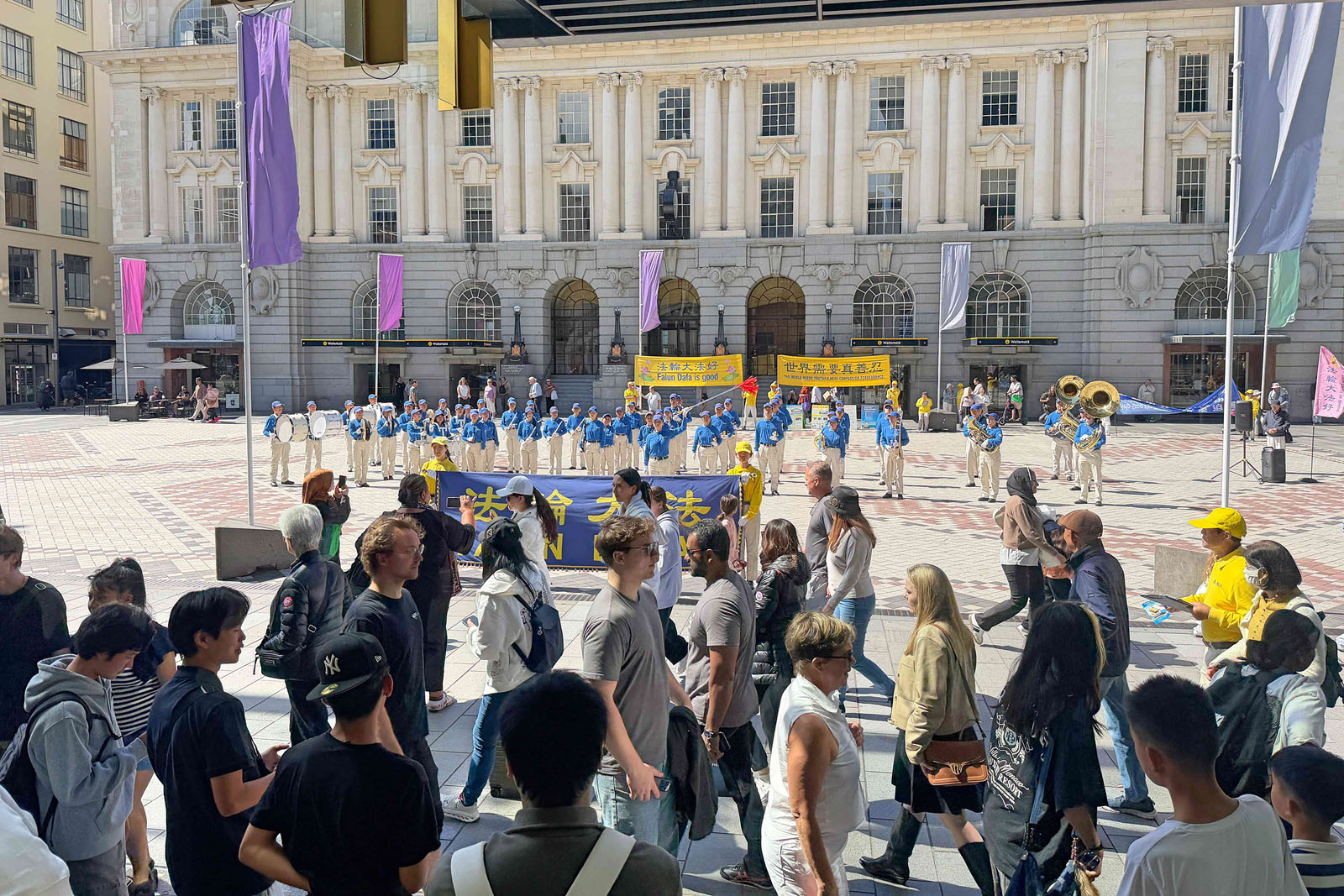 (Minghui.org) 21 марта 2026 года практикующие провели мероприятие в торговом центре Commercial Bay в Окленде, чтобы познакомить общественность с Фалунь Дафа. Небесный оркестр Тянь Го исполнил музыкальные произведения, практикующие продемонстрировали упражнения и провели митинг, рассказав о преследовании Фалунь Дафа компартией Китая (КПК).
