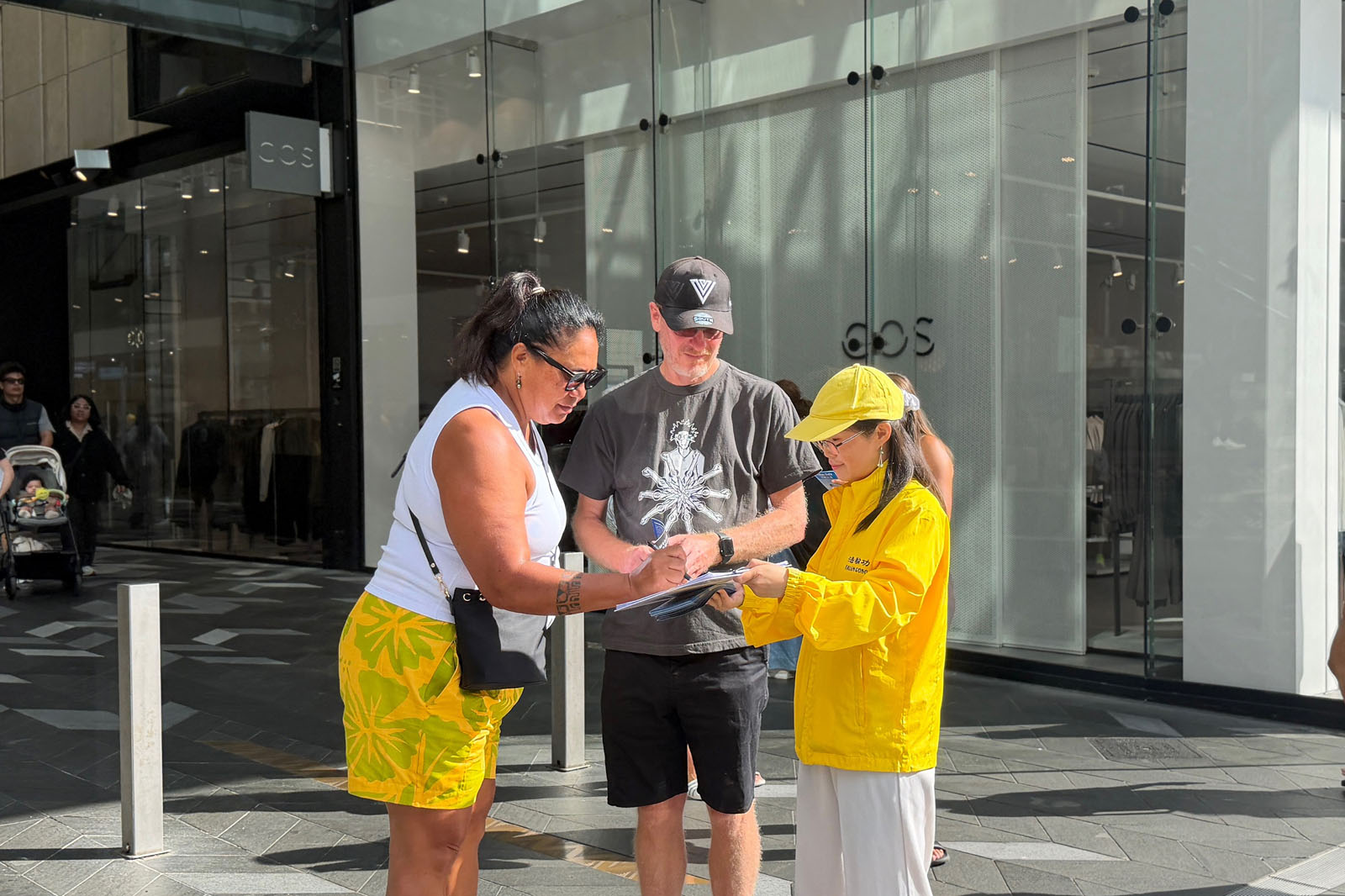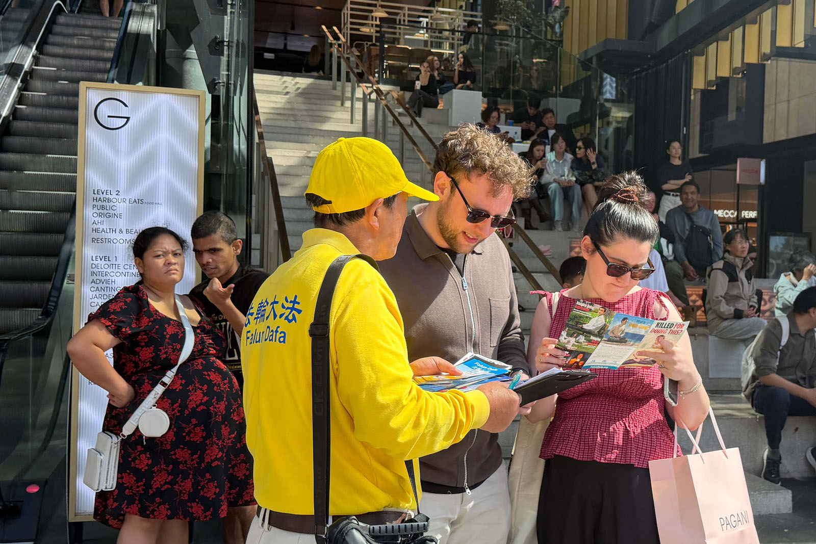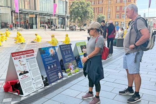 Туристы, покупатели и другие прохожие останавливались, чтобы понаблюдать, сфотографироваться, прочитать информацию и поговорить с практикующими и узнать больше о Фалунь Дафа и преимуществах этой практики. Многие также впервые узнали о продолжающемся преследовании практикующих компартией Китая.