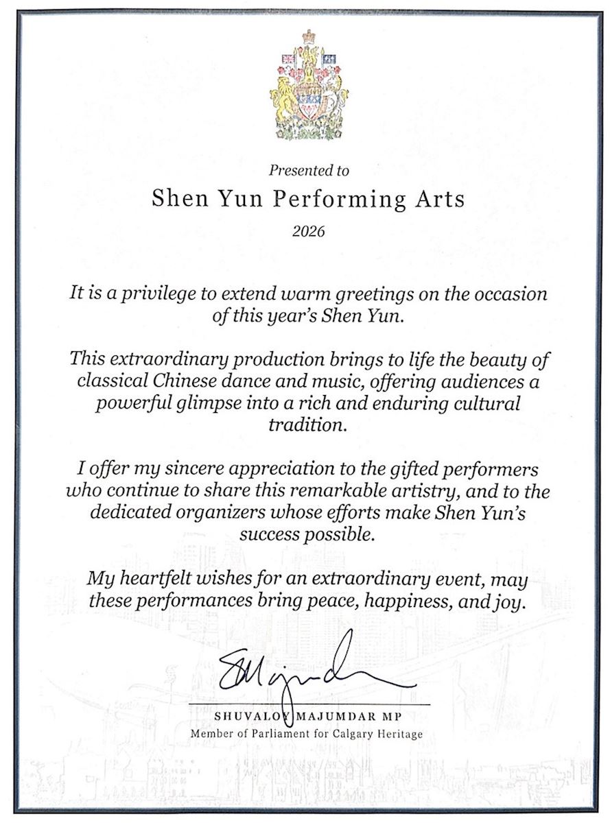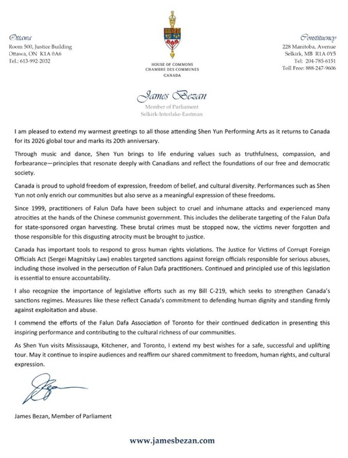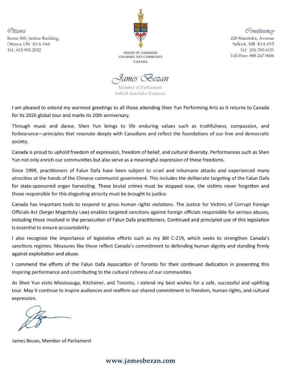 Джеймс Безан, член парламента от штата Манитоба, написал: «Я рад передать свои самые тёплые поздравления всем, кто посетит представления компании Shen Yun Performing Arts, которая в рамках своего мирового турне 2026 года снова выступит в Канаде, а также в связи с 20-летним юбилеем творческой деятельности коллектива».