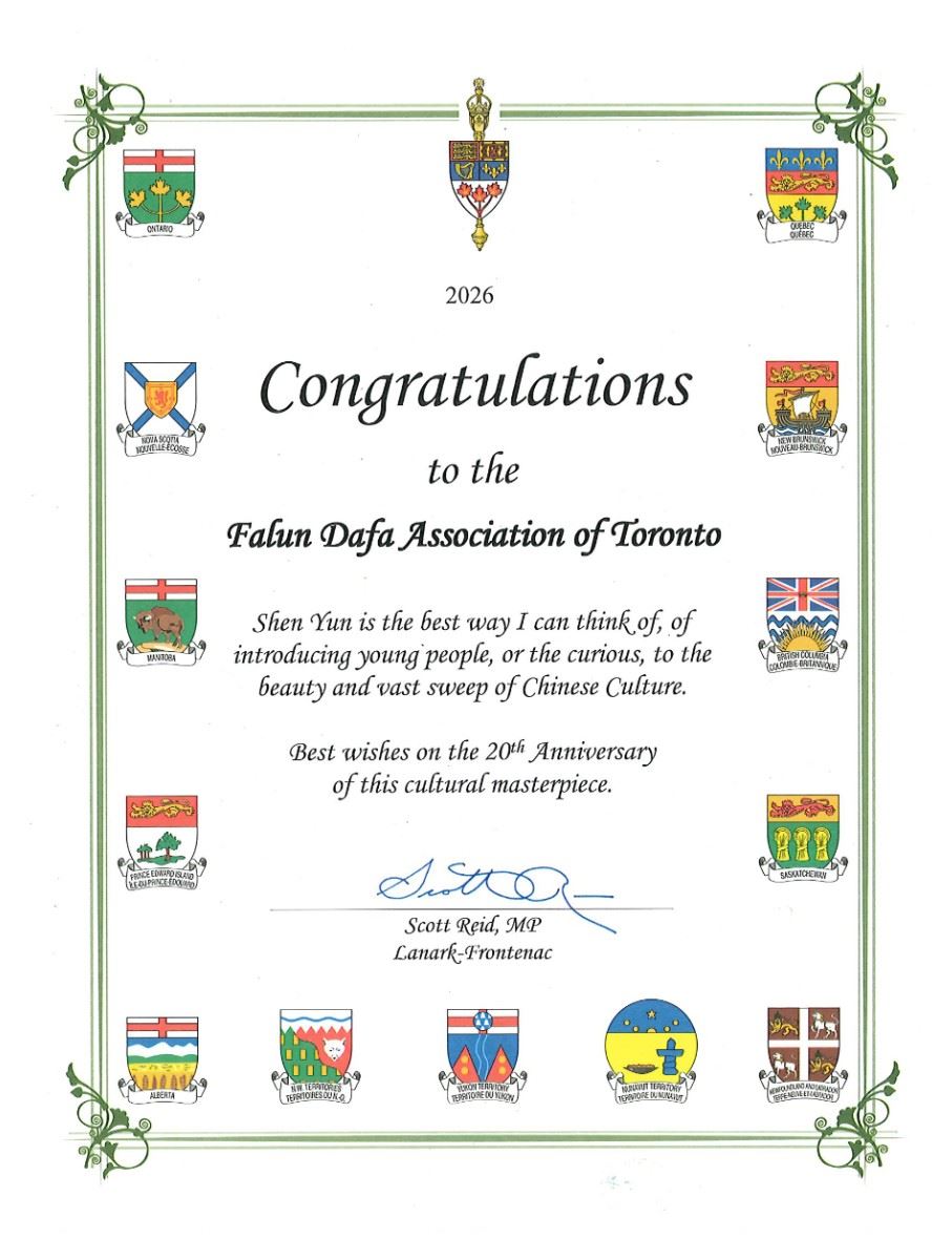 Поздравление от Скотта Рида, члена парламента от провинции Онтарио