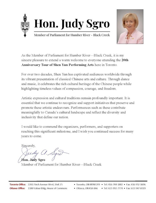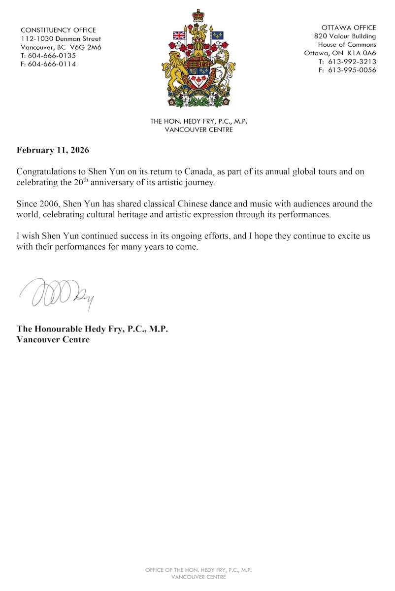 Хеди Фрай, член парламента от округа Ванкувер-Центр, написала: «Поздравляю Shen Yun с возвращением в Канаду в рамках ежегодных мировых гастролей и с празднованием 20-летия своего творческого пути.