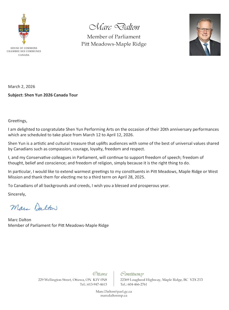 Марк Далтон, член парламента от округа Питт-Медоуз-Мейпл-Ридж, написал: «Shen Yun – это художественное и культурное сокровище, которое вдохновляет зрителей лучшими универсальными ценностями, разделяемыми канадцами, такими как милосердие, мужество, верность, свобода и уважение».
