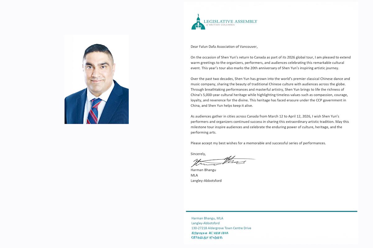 Харман Бхангу, член Законодательного собрания (MLA) Британской Колумбии, написал: «За последние два десятилетия Shen Yun превратился в ведущий в мире коллектив классического китайского танца и музыки, который делится красотой традиционной китайской культуры со зрителями по всему миру. Благодаря захватывающим дух представлениям и виртуозному мастерству Shen Yun воплощает в жизнь богатство 5000-летнего культурного наследия Китая, одновременно подчеркивая вечные ценности, такие как милосердие, мужество, верность и почитание Божественного. Это наследие подвергалось уничтожению в период правлении КПК в Китае, и Shen Yun помогает сохранить его».