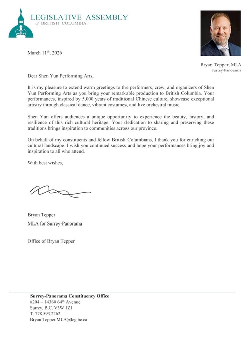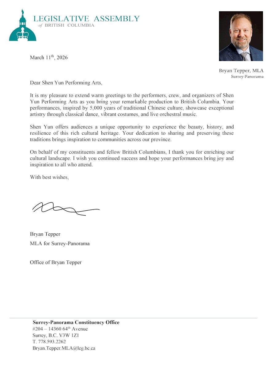 Брайан Теппер, член Законодательного собрания Британской Колумбии, написал: «Я с удовольствием направляю тёплые приветствия артистам, технической команде и организаторам Shen Yun Performing Arts, которые привезли своё замечательное представление в Британскую Колумбию. Ваши представления, вдохновлённые 5000-летней традиционной китайской культурой, демонстрируют исключительное мастерство через классический танец, яркие костюмы и живую оркестровую музыку.