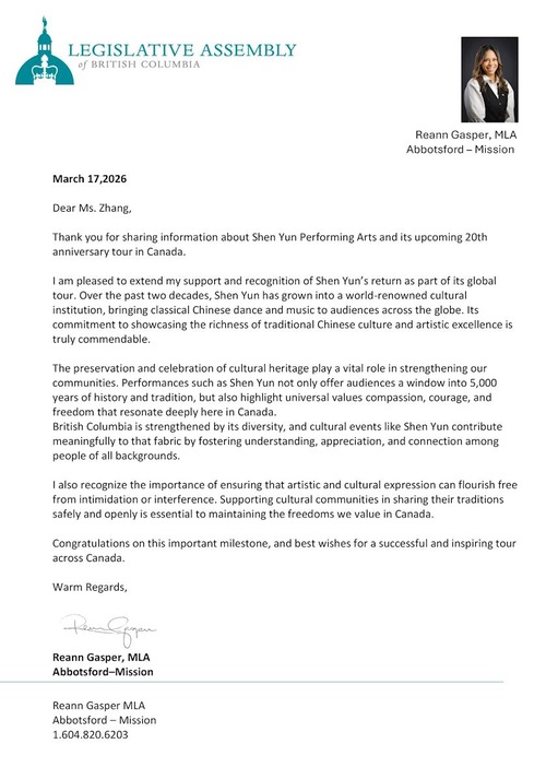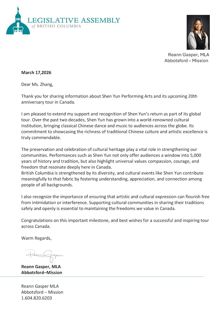 Реанн Гаспер, член Законодательного собрания Британской Колумбии, написала: «За последние два десятилетия Shen Yun превратился во всемирно известное культурное учреждение, знакомящее зрителей по всему миру с классическим китайским танцем и музыкой. Его стремление продемонстрировать богатство традиционной китайской культуры и высочайшее художественное мастерство действительно достойно похвалы».