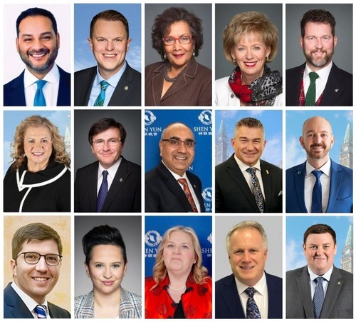 Первый ряд, слева направо: Шувалой Маджумдар, член парламента от провинции Альберта; Брэд Вис, член парламента от Британской Колумбии; Хеди Фрай, член парламента от округа Ванкувер-Центр и член Тайного совета (PC); Джуди Сгро, член парламента, бывший министр по делам иммиграции и сопредседатель парламентской группы «Друзья Фалуньгун» и Скотт Рид, член парламента от провинции Онтарио.