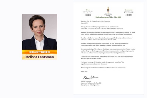 Мелисса Ланцман, член парламента и заместитель лидера оппозиции, написала: «На протяжении многих лет Shen Yun делится с миллионами канадцев очарованием классического китайского танца, вдохновляя и просвещая зрителей благодаря своим ярким постановкам, повествующим о древней истории».