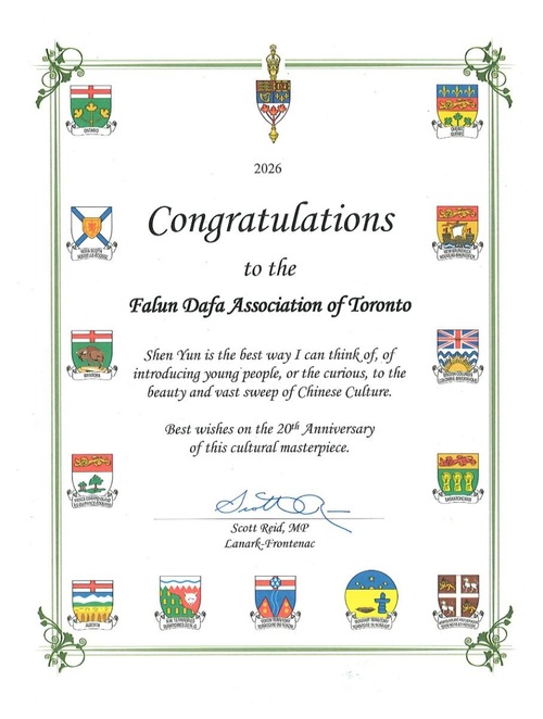Член парламента от Консервативной партии Костас Менегакис, представляющий округ Аврора-Оук-Риджес-Ричмонд-Хилл, вручил труппе Shen Yun официальную грамоту и отметил, что эта труппа «вдохновляет зрителей по всему миру благодаря классическому китайскому танцу и музыке, делясь богатством традиционной культуры, высоким художественным мастерством и вечными ценностями».