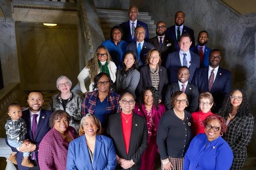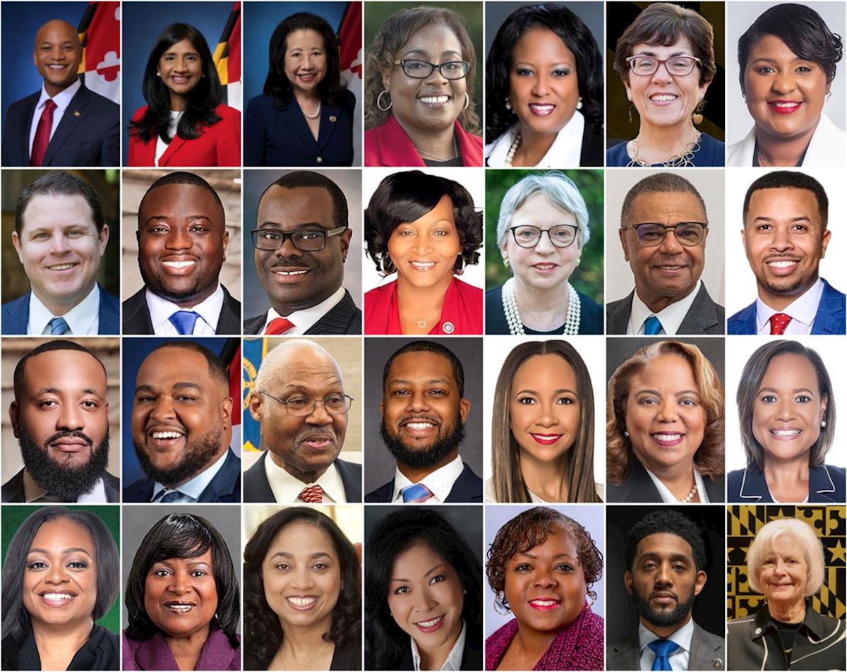 Четвертый ряд: делегаты штата Мэриленд Карен Толес, Вероника Тернер, Джозелин Пена-Мельник, Крисельда Вальдеррама и Джамила Вудс; мэр Балтимора Брэндон М. Скотт; глава администрации округа Балтимор Кэтрин А. Клаусмейер