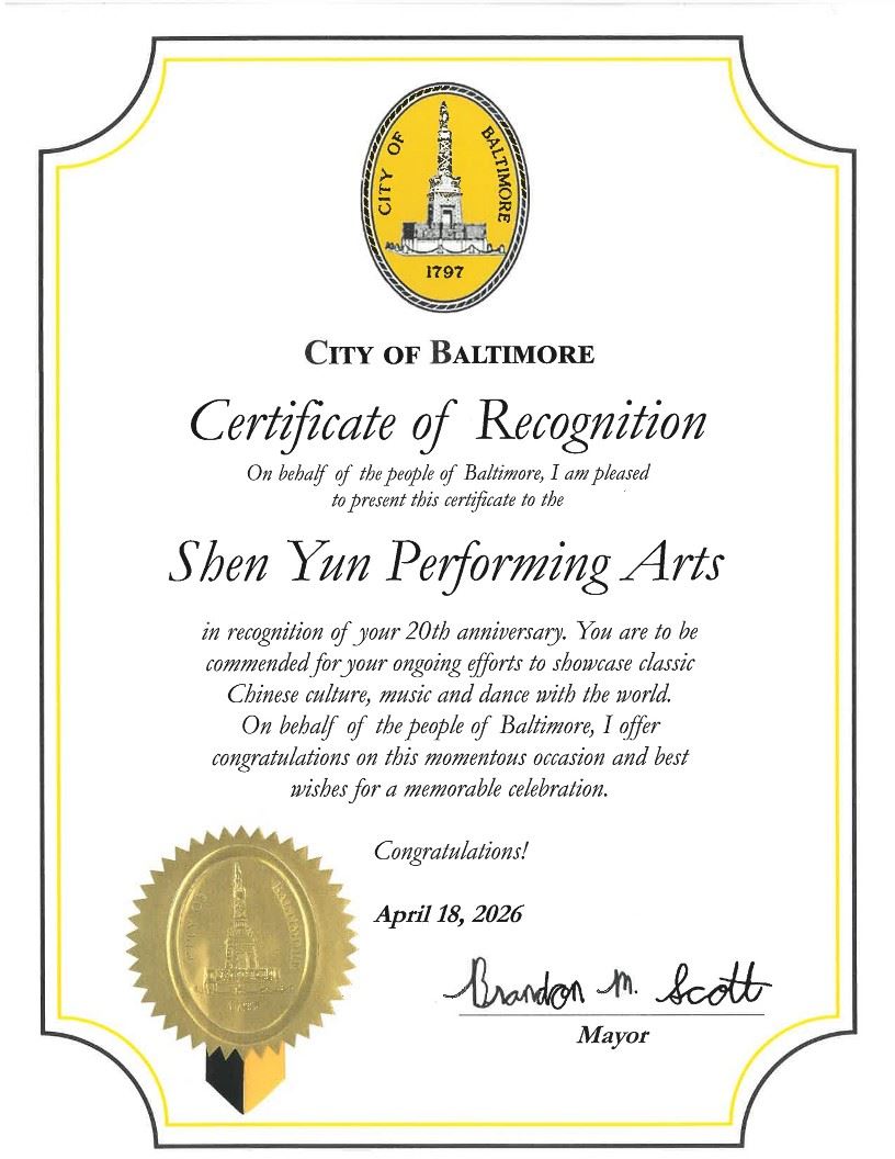 Мэр Брэндон М. Скотт написал: «От имени жителей Балтимора я рад вручить эту почётную грамоту коллективу Shen Yun Performing Arts в знак признания и по случаю вашего 20-летия. Примите благодарность за ваши постоянные усилия по продвижению классической китайской культуры, музыки и танца всему миру. От имени жителей Балтимора я поздравляю вас с этим знаменательным событием и желаю вам незабываемого празднования».