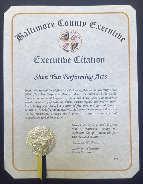 Глава администрации округа Кэтрин А. Клаусмейер написала: «В знак признания Shen Yun Performing Arts и в связи с 20-летним юбилеем деятельности. С 2006 года Shen Yun Performing Arts делится своими ценностями со всем миром. Посредством универсального языка музыки и танца Shen Yun создаёт удивительное полотно небесных миров, древних легенд и современных героических историй, отправляя зрителя в путешествие по пятитысячелетней истории китайских традиций. От имени всех жителей округа Балтимор мы поздравляем вас с этим знаменательным событием и с гордостью отмечаем ваш значительный вклад в развитие округа».