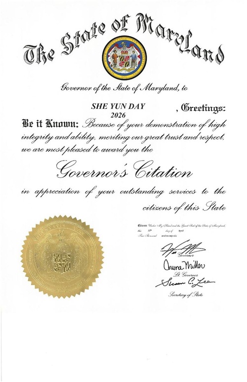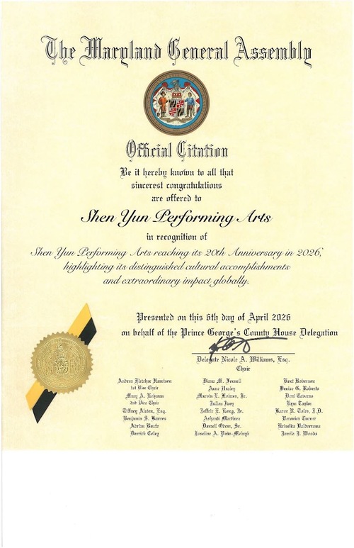 Благодарственная грамота датирована 18 апреля, днём первого выступления Shen Yun в Балтиморе. Её также подписали вице-губернатор Аруна Миллер и секретарь штата Сьюзан С. Ли.