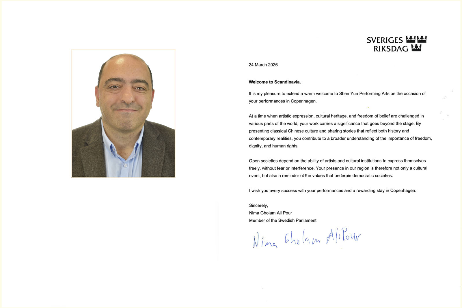 Депутат парламента Нима Голам Али Пур направил письмо компании Shen Yun Performing Art с приветствием по случаю гастрольного турне труппы в Скандинавии