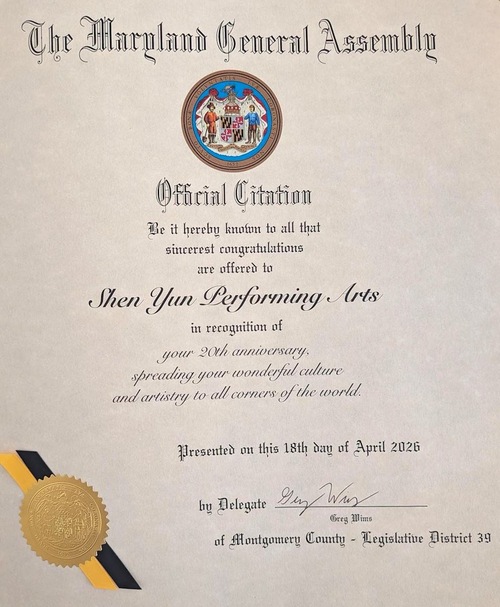 (Minghui.org) Труппа Shen Yun Performing Arts, базирующаяся в США, вновь возвращается в город Балтимор в штате Мэриленд, где с 18 по 19 апреля 2026 года даст три представления на сцене исторического театра Hippodrome. Депутат законодательного собрания штата Мэриленд Грег Уимс направил труппе Shen Yun Performing Arts официальное поздравительное письмо, отметив значительный вклад компании в распространение культуры и искусства по всему миру.
