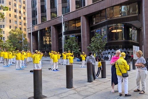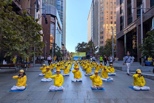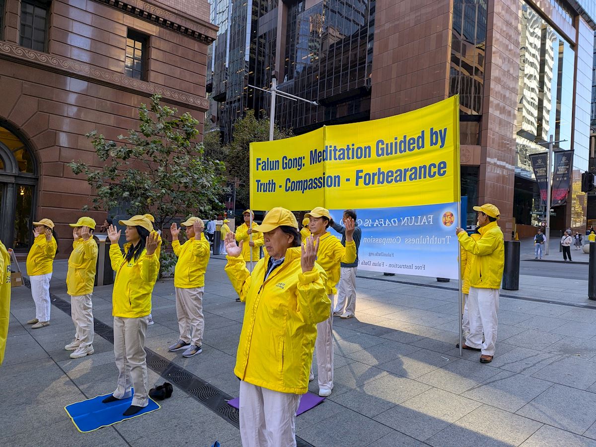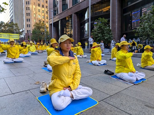 Практикующие демонстрируют упражнения Фалуньгун на Мартин-плейс, Сидней (Австралия), 16 апреля 2026 года