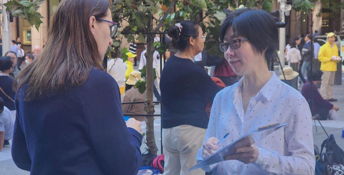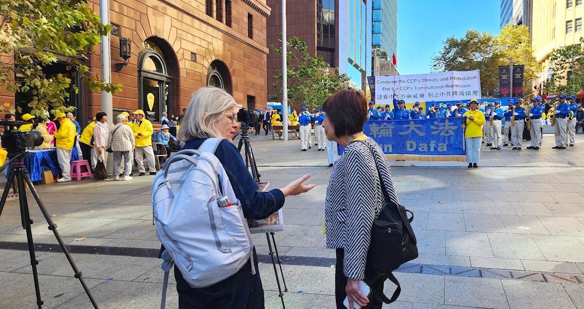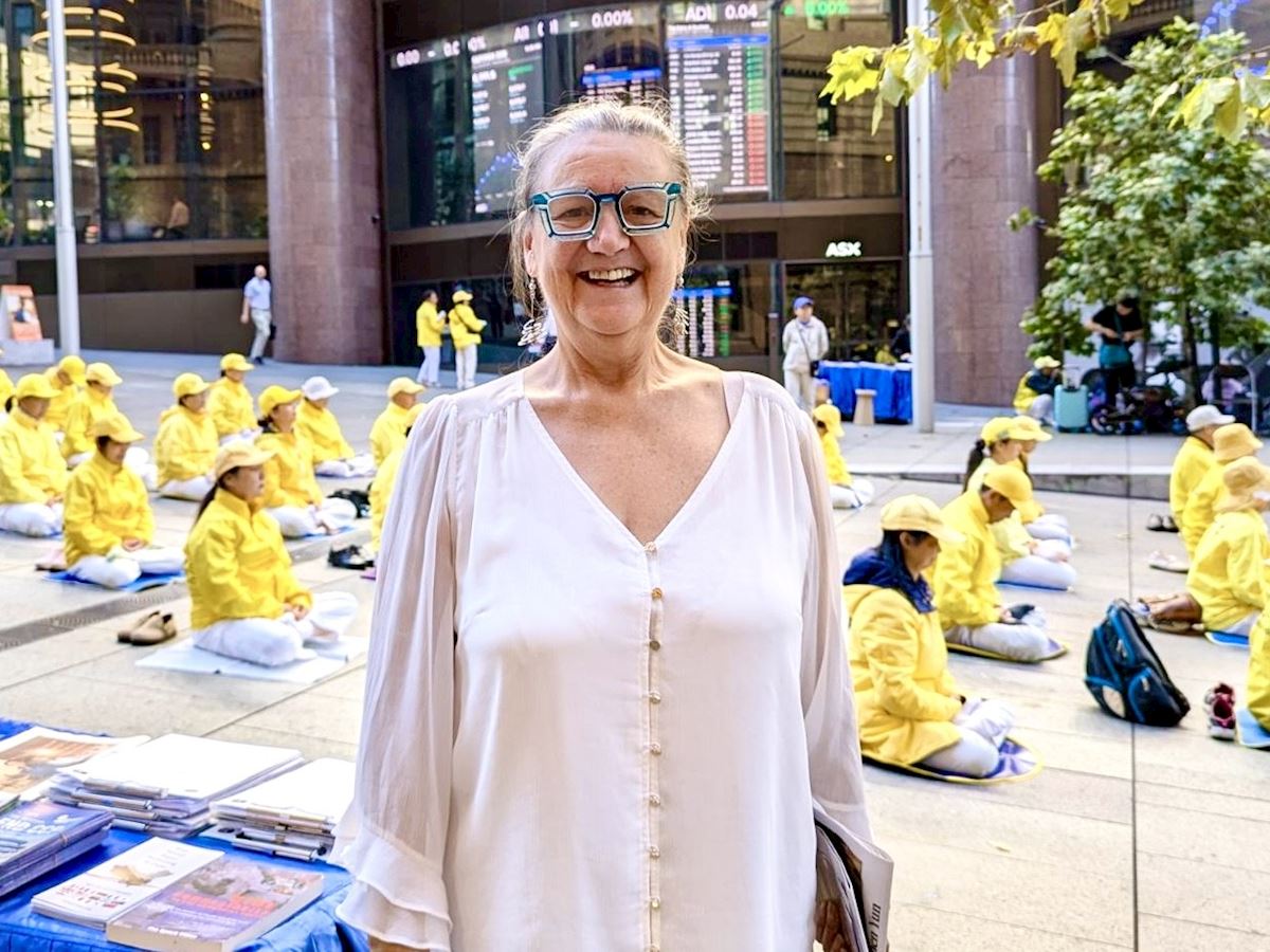 Она сказала, что мероприятие прошло чудесно: «Это действительно очень ясный способ донести правду, потому что многие австралийцы, возможно, ещё не знакомы с Фалуньгун. Если бы они понимали, что в Китае людей можно наказать просто за их убеждения, я думаю, большинство австралийцев было бы шокировано. Отсутствие свободы, неспособность открыто думать, говорить или следовать своей вере, нас действительно ужасает».