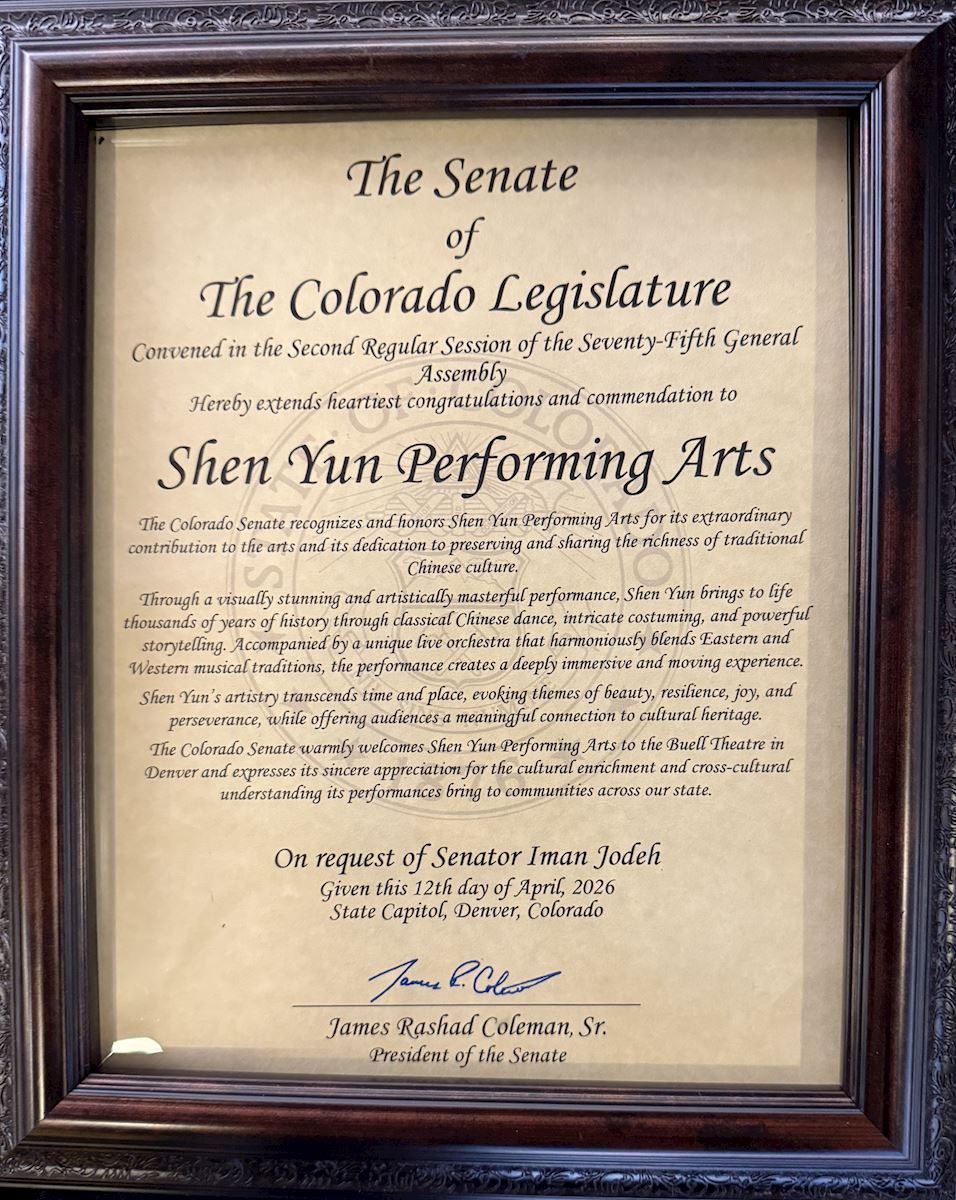 Сенатор от штата Колорадо Иман Джоде посетила представление Shen Yun в Денвере 12 апреля 2026 года. От имени Сената законодательного собрания штата Колорадо она вручила труппе памятную награду.