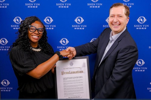 Нанташа Уильямс, заместитель спикера городского совета Нью-Йорка, посмотрела спектакль Shen Yun в Нью-Йорке 12 апреля. Она вручила труппе благодарственную грамоту, в которой поздравила Shen Yun с 20-летним юбилеем.