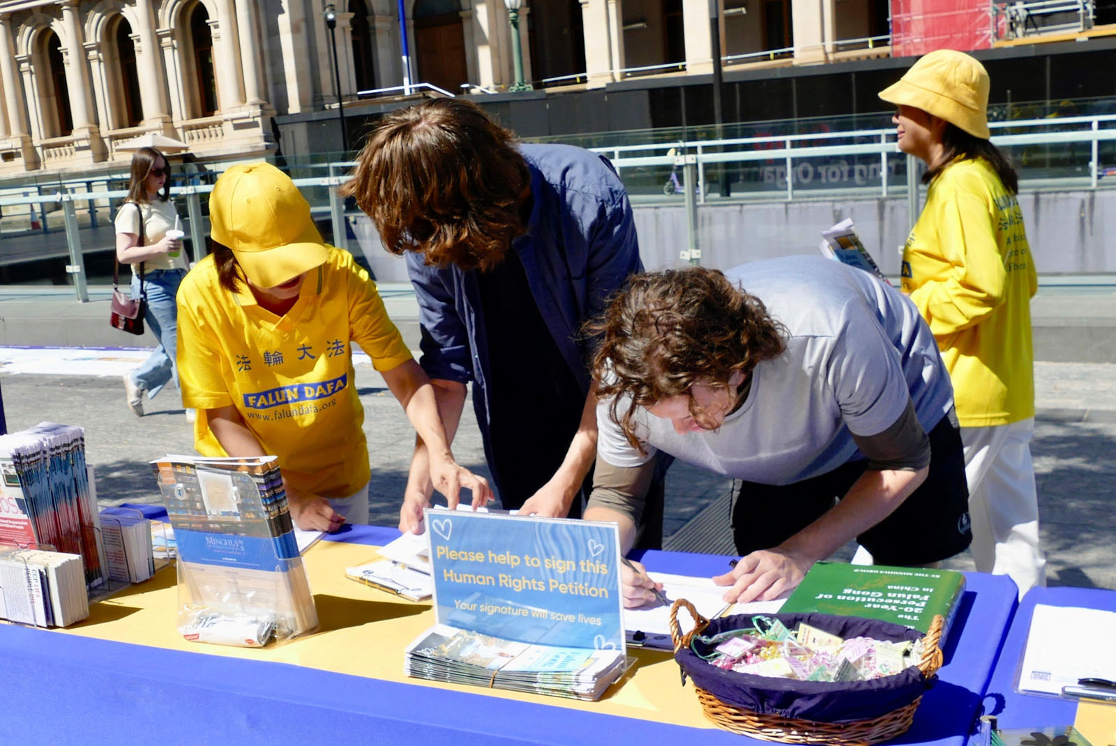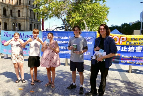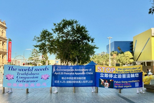 (Minghui.org) 18 апреля 2026 года практикующие Фалунь Дафа в Австралии провели мероприятие на площади в городе Брисбене (штат Квинсленд), чтобы отметить 27-ю годовщину мирного обращения 25 апреля 1999 года в Пекине. Развернув плакаты, они выполняли упражнения Фалунь Дафа и рассказывали прохожим правду о преследовании.